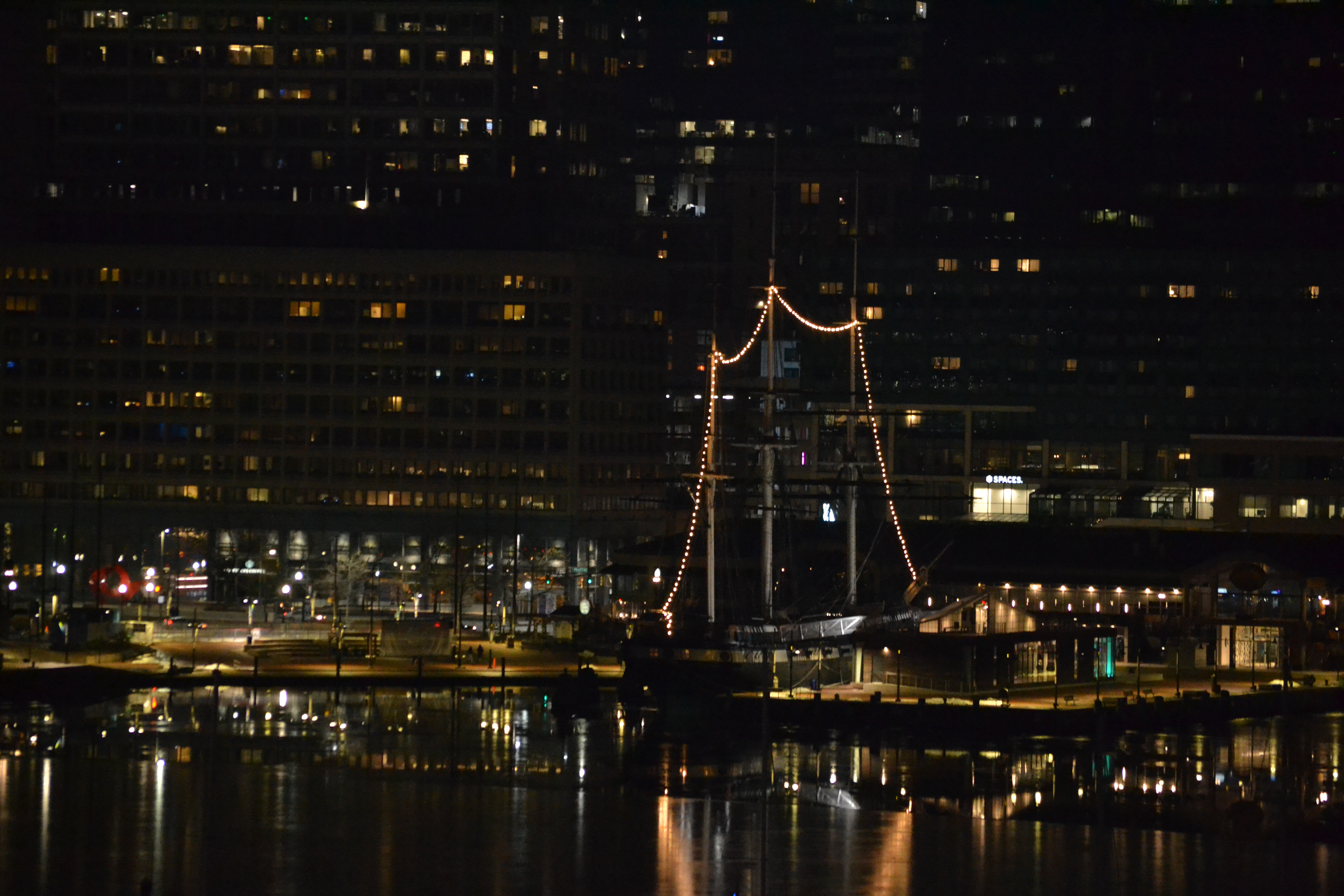 This image captures a pirate ship docked in Baltimore, with the surrounding buildings casting their light onto the harbor water. The way the lights reflect off the surface and produce a shimmering, almost magical effect is what makes it visually appealing to me.