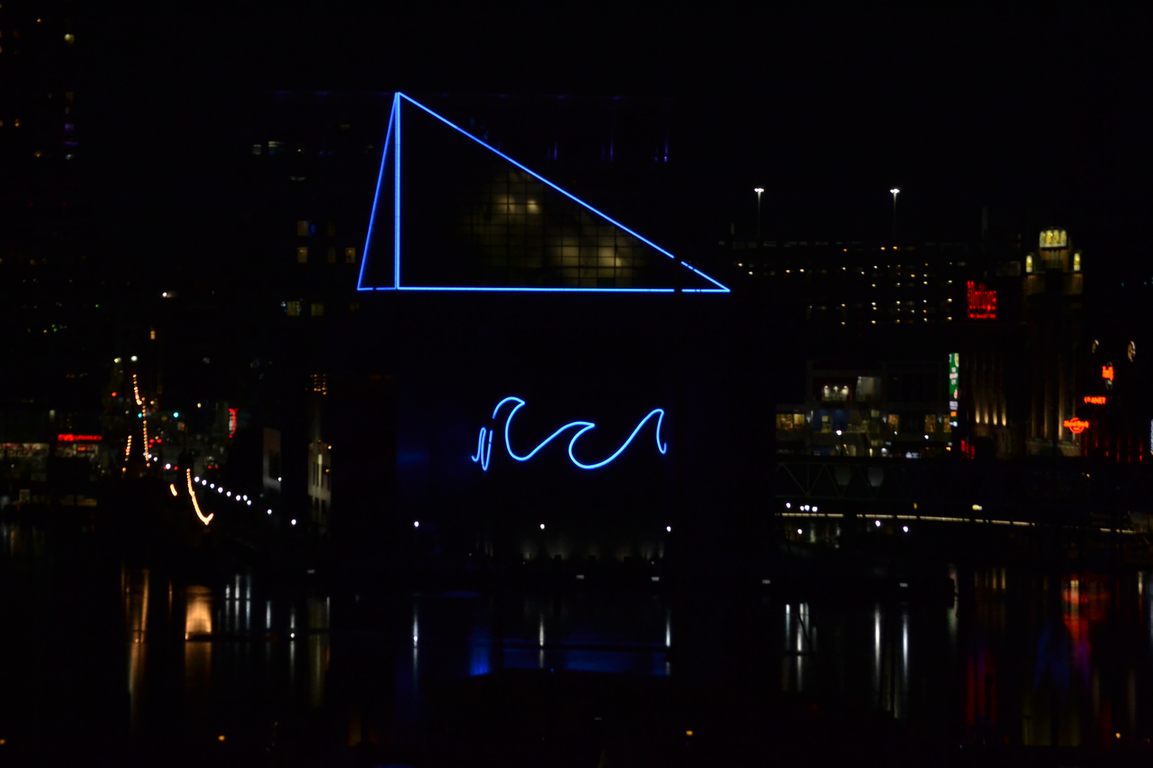 This photograph shows the Baltimore Aquarium at night, with its lights illuminating the harbor and bouncing off the water. The lighting highlights the building's architectural lines, which create eye-catching geometric patterns that almost seem three dimensional, which is why I find it visually appealing. Bright lighting and shadow combine to produce depth, emphasizing the structure's angles in a way that is visually impressive.