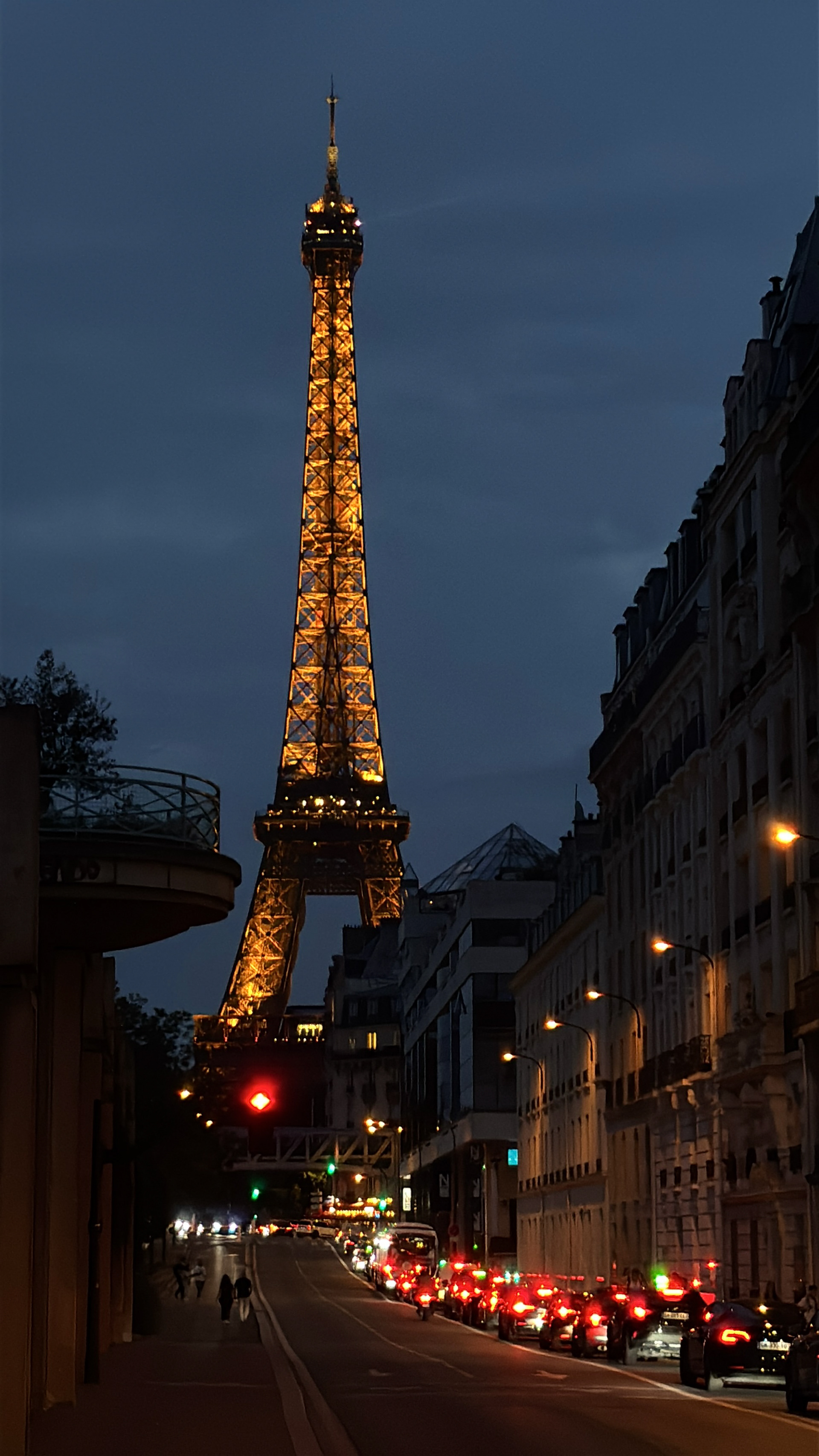 The Eiffel Tower glows warmly against a deep blue evening sky, rising above a Paris street alive with headlights and motion. The difference between historic architecture and modern city traffic captures the energy of the city after dark.
